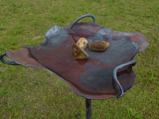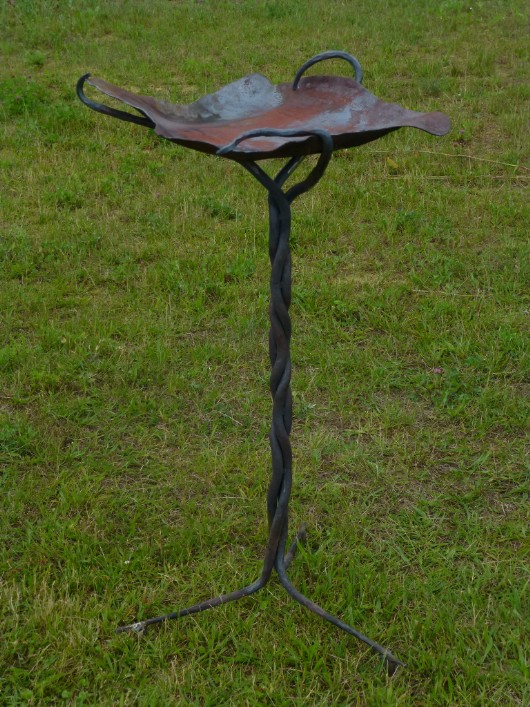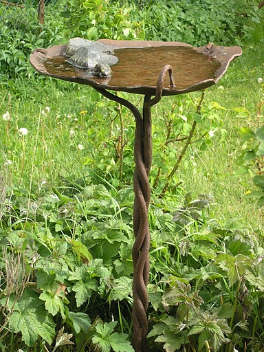Cortenstahl eignet sich hervorragend für Vogeltränken. Nach der vollständigen Rostung des Materials bleibt das Wasser klar, und die Vögel suchen die Vogeltränken gerne auf. Zusammen mit der geschmiedeten Schale liefere ich einen stabilen Standfuß aus drei tordierten Rundstählen, so daß die gesamte Vogeltränke einen Blickfang im Garten bildet.